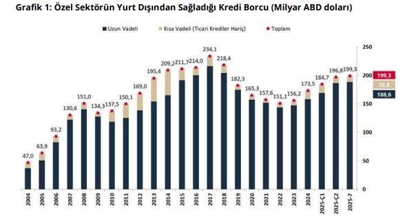 Türkiye Cumhuriyet Merkez Bankası’nın (TCMB) temmuz ayı özel sektörün yurt dışından sağladığı toplam kredi borcunu açıkladı. Buna göre özel sektörün borcu temmuz 2025 itibarıyla 199,3 milyar dolar oldu.