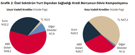 Döviz kompozisyonuna bakıldığında, ABD doları cinsinden borçlanmanın en yüksek paya sahip olduğu görüldü. 188,6 ABD doları tutarındaki uzun vadeli kredi borcunun %58,2’sinin ABD doları, %32,2’sinin Euro, %2,0’ının Türk lirası ve %7,6’sının ise diğer döviz cinslerinden oluştuğu; 10,8 milyar ABD doları tutarındaki kısa vadeli kredi borcunun ise %30,7’sinin ABD doları, %20,5’inin Euro, %47,2’sinin Türk lirası ve %1,6’sının ise diğer döviz cinslerinden oluştuğu görüldü.