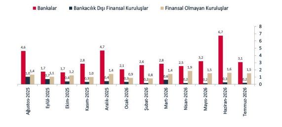 Temmuz sonuna göre özel sektörün yurt dışından sağladığı toplam kredi borcunun 1 yıla kadar olan vade dağılımı incelendiğinde, toplam borç tutarının 59,4 milyar ABD doları olduğu görüldü. Bu tutarın 38,7 milyar ABD doları bankalara, 15,8 milyar ABD doları finansal olmayan kuruluşlara, 4,9 milyar ABD doları ise bankacılık dışı finansal kuruluşlara aittir.